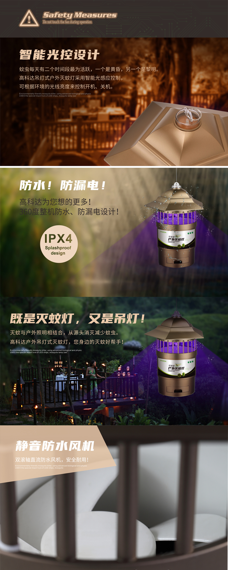 1、采用智能光感应开关,白天自动关机,晚上自动开机。2、双滚轴直流防水风机,带IC防堵转保护,吸力更强,安全稳定,寿命更长。