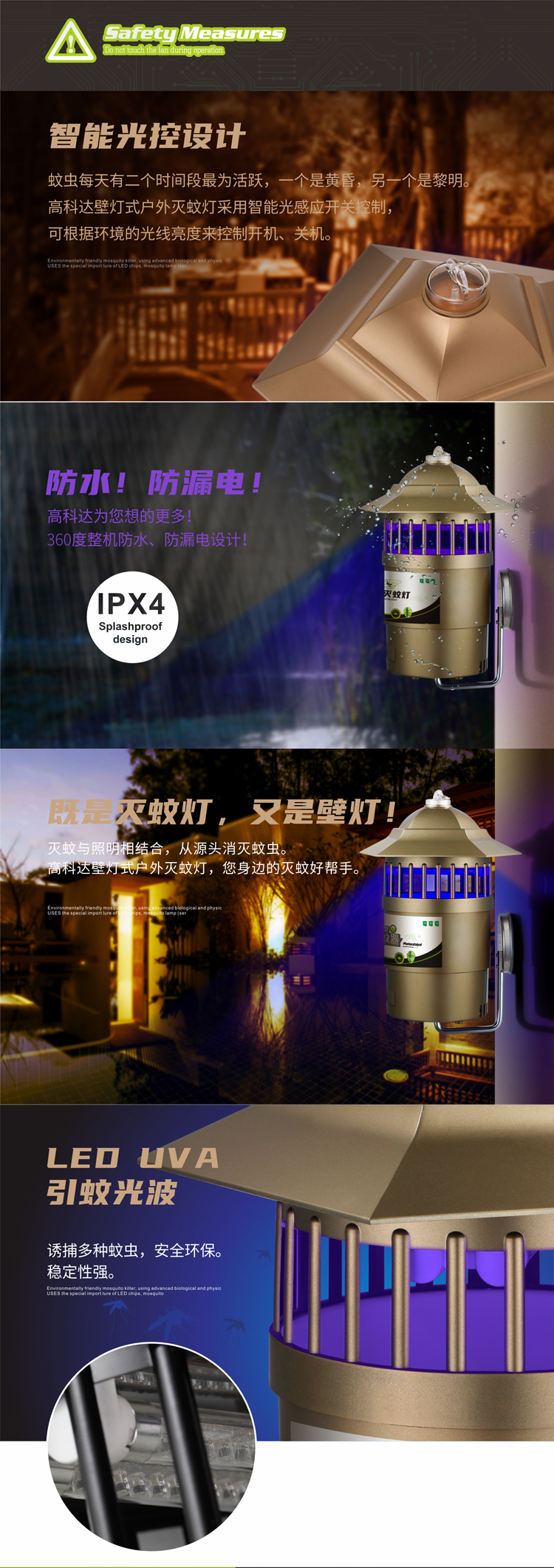 1、采用智能光感应开关,白天自动关机,晚上自动开机。2、双滚轴直流防水风机,带IC防堵转保护,吸力更强,安全稳定,寿命更长。