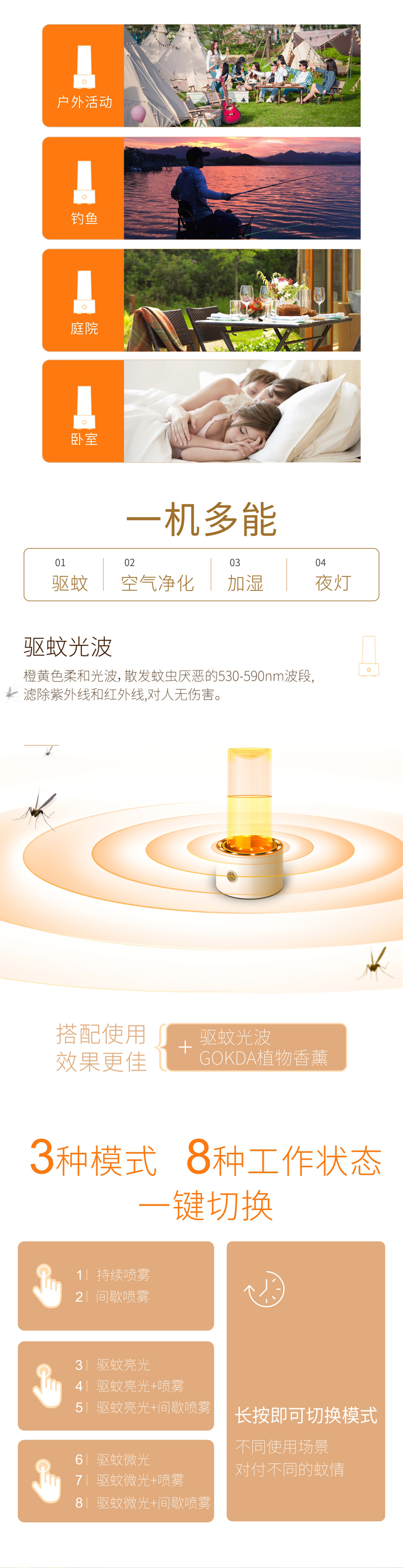 5、一机多能 ,驱蚊、空气净化、加湿、小夜灯。