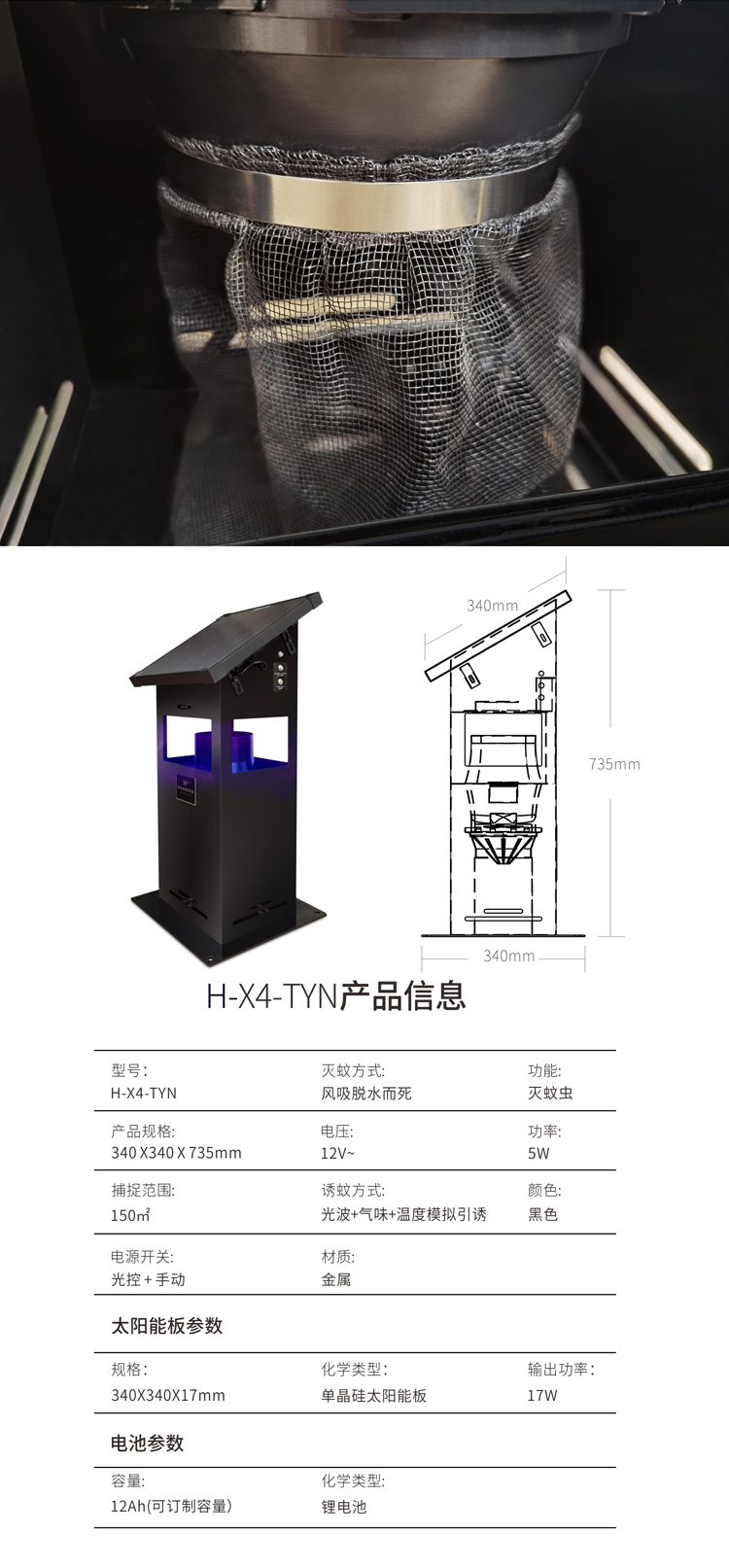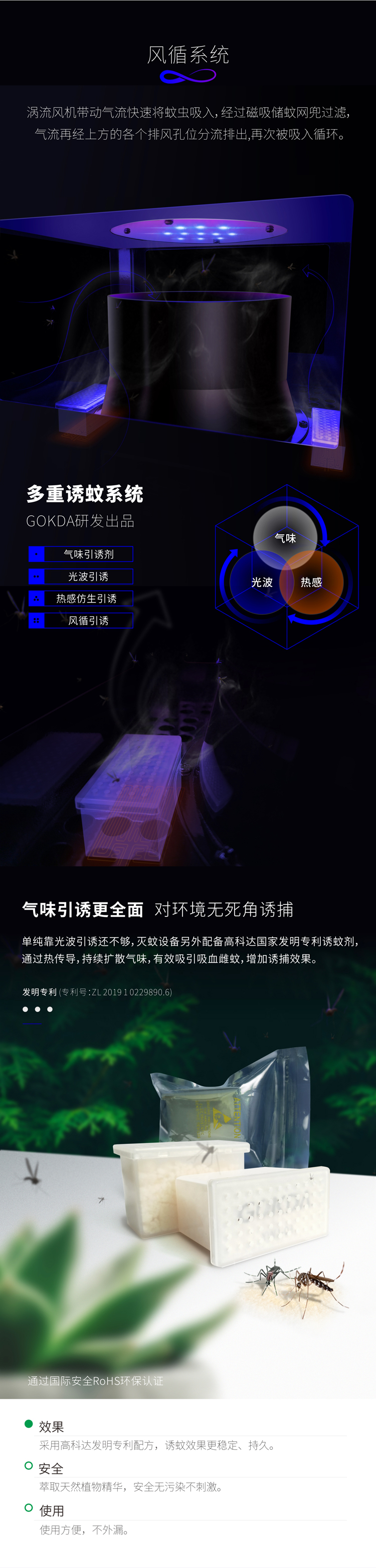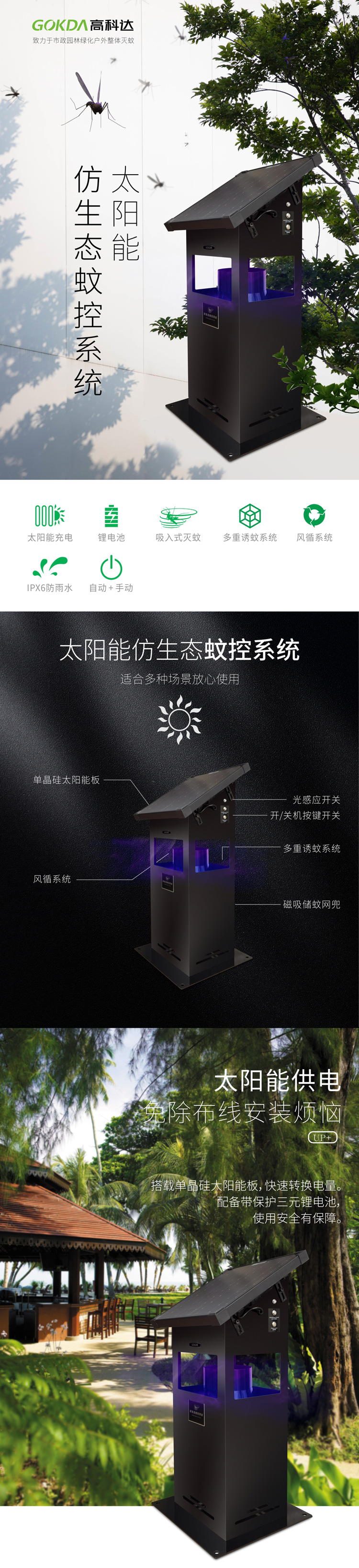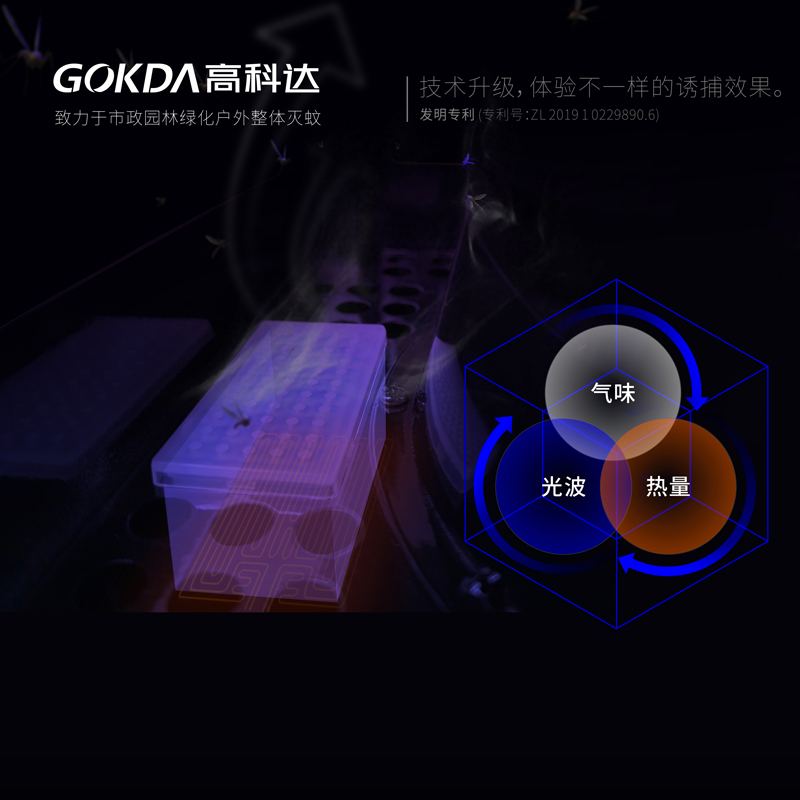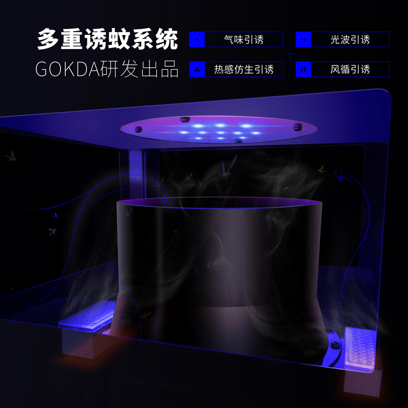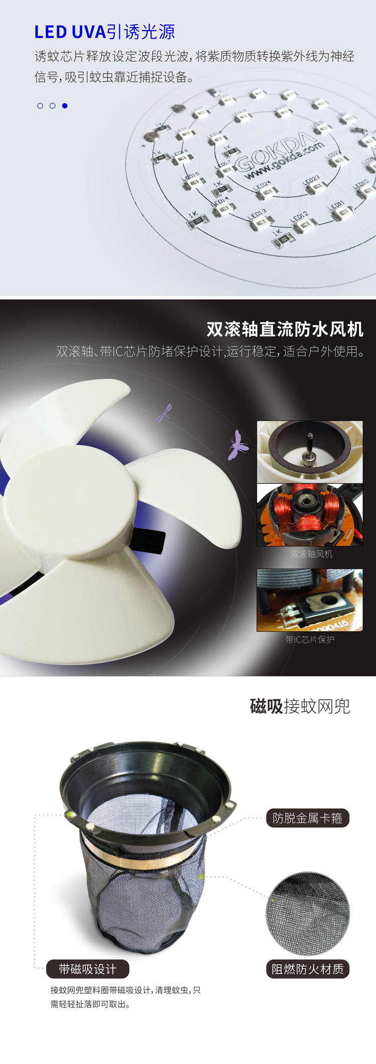 1、采用GOKDA研发多重诱蚊系统(专利气味引诱/光波引诱/热感仿生引诱/风循引诱)。2、太阳能供电,免除布线安装烦恼。搭载单晶硅大阳能板,快速转换电量。配备带保护三元锂电池,使用安全有保障。